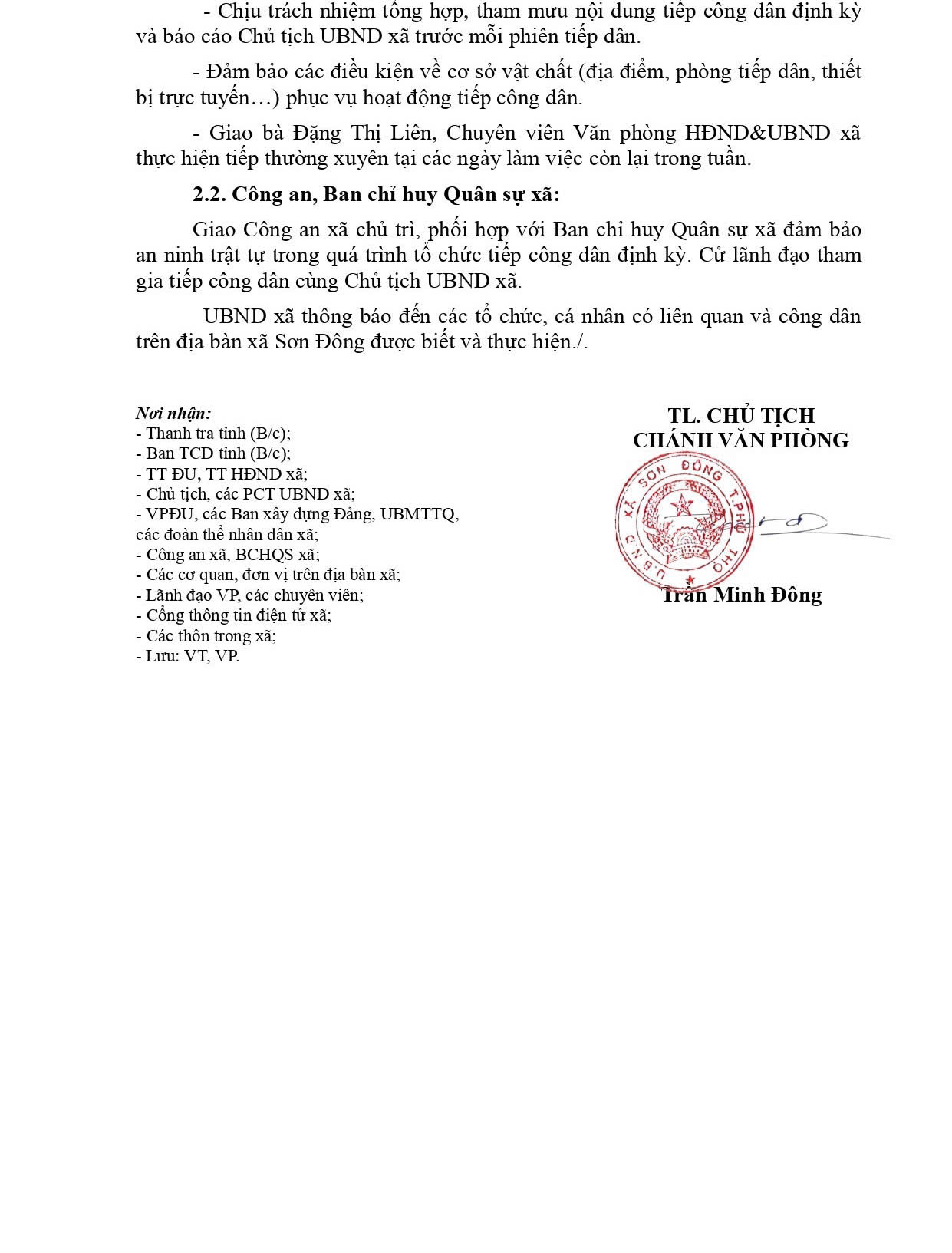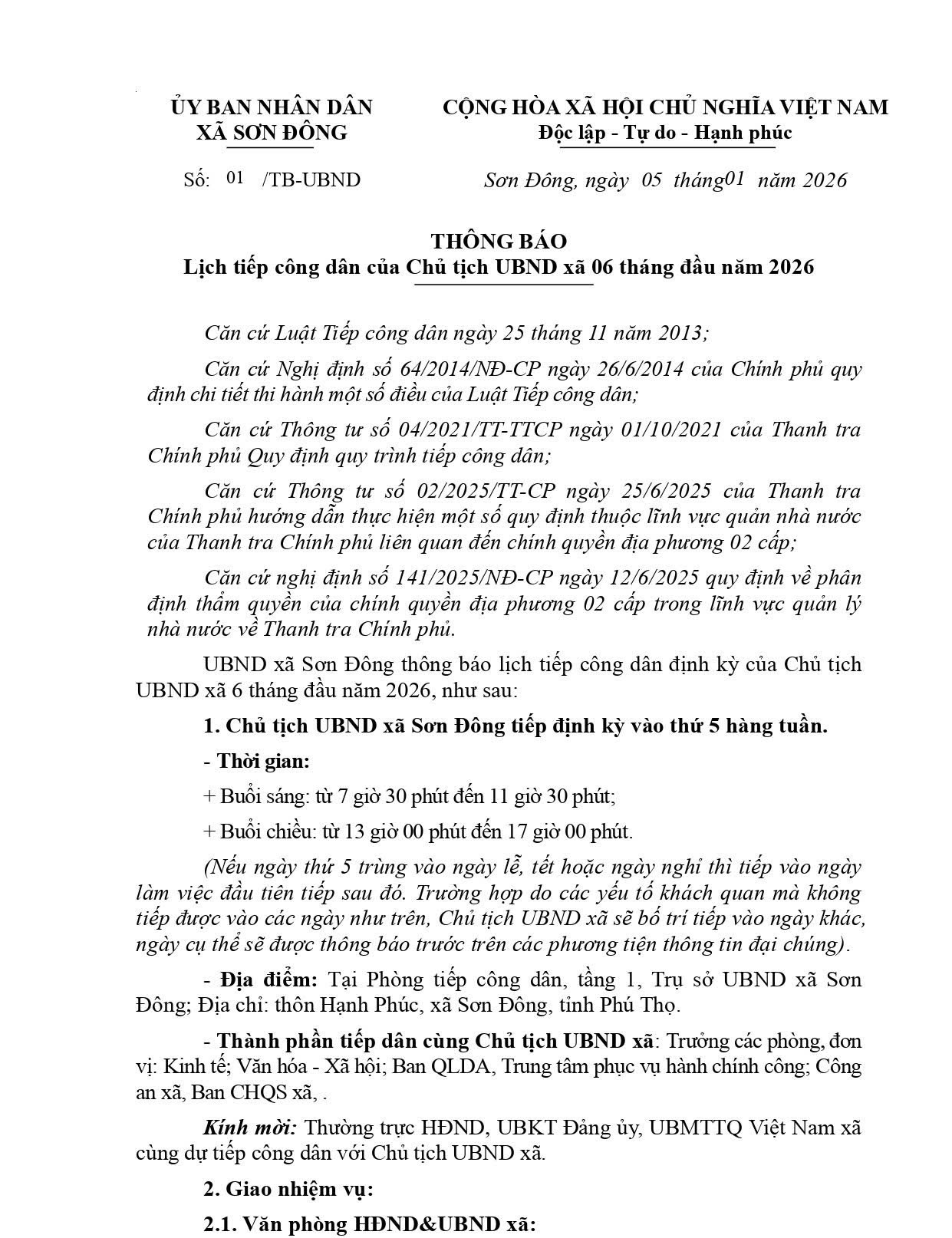 Lịch tiếp công dân của Chủ tịch UBND xã 06 tháng đầu năm 2026 Post Views: 14 Xem thêm lịch làm việc Hội Nông dân xã Sơn Đông chung sức xây dựng tuyến đường “Sáng – Xanh – Sạch – Đẹp – An toàn” Đảng ủy xã Sơn Đông tổ chức Hội nghị nghiên cứu, học tập, quán triệt Nghị quyết Hội nghị lần thứ hai Ban Chấp hành Trung ương Đảng khóa XIV Ban Chỉ huy Quân sự xã Sơn Đông tổ chức đăng ký nghĩa vụ quân sự lần đầu cho thanh niên tuổi 17 năm 2026 Cụm số 17 dâng hương tưởng niệm các Vua Hùng Thư cảm ơn